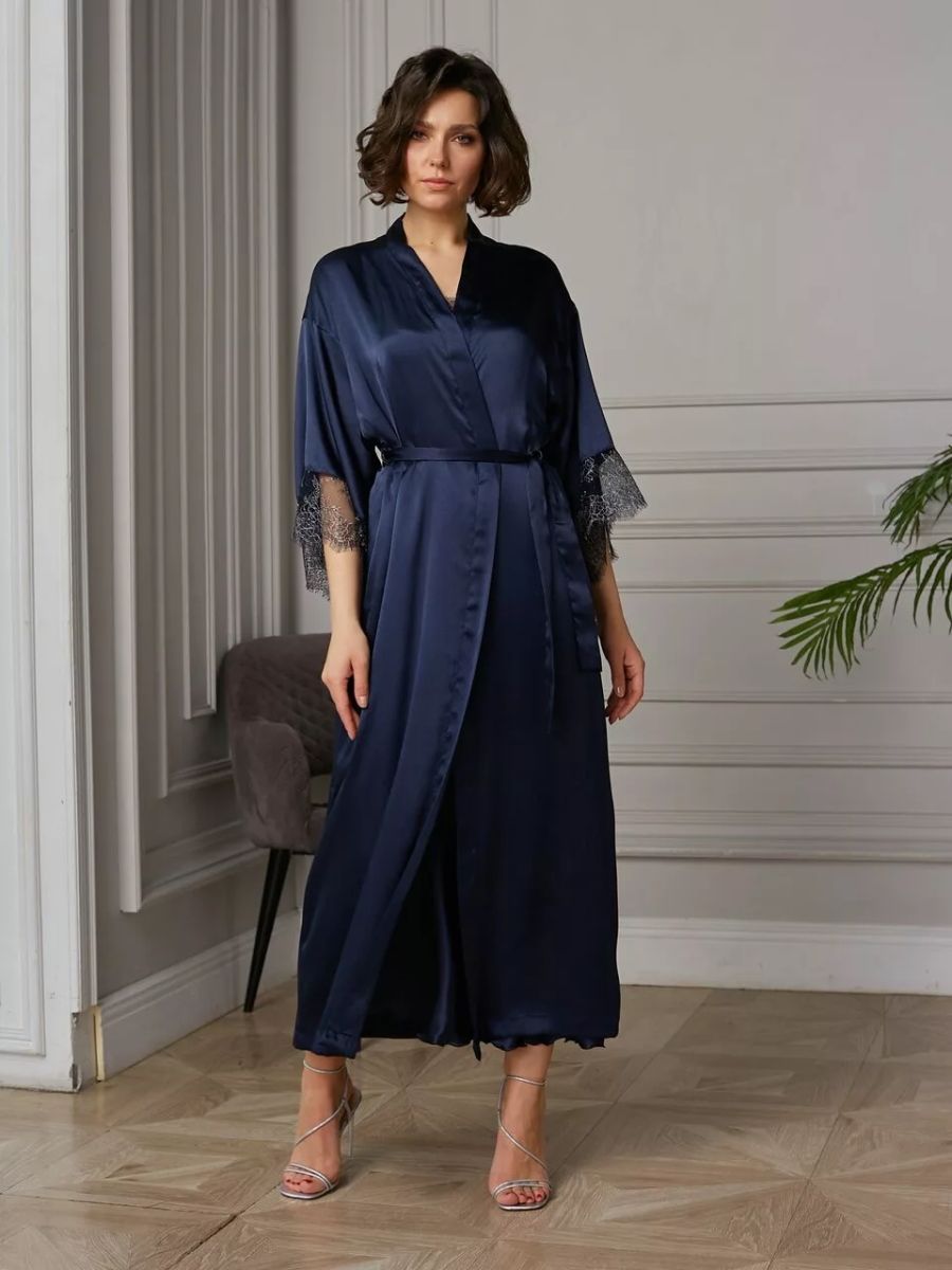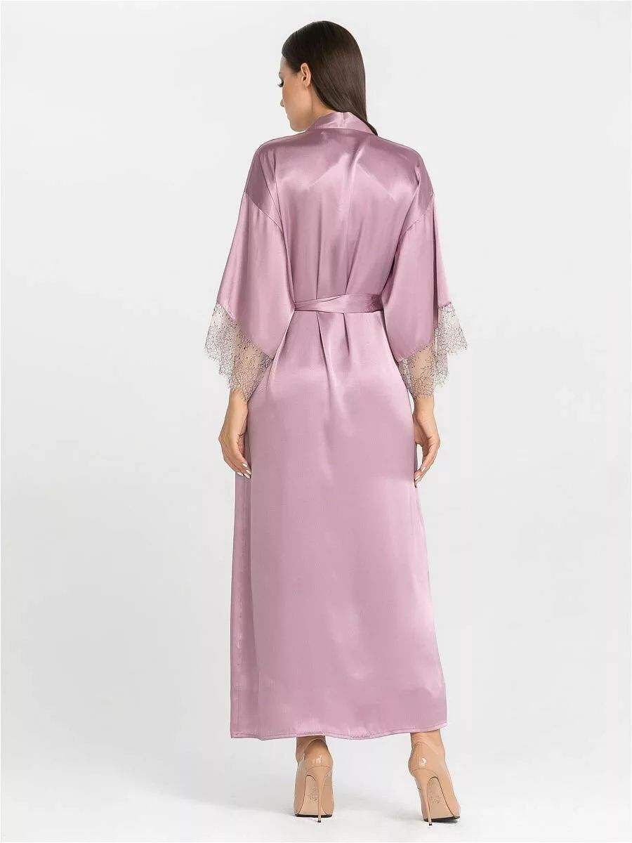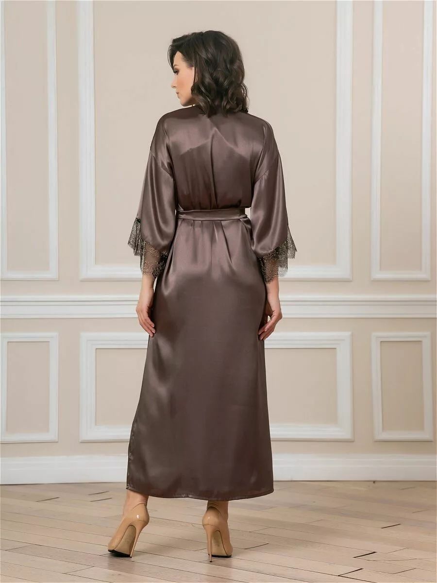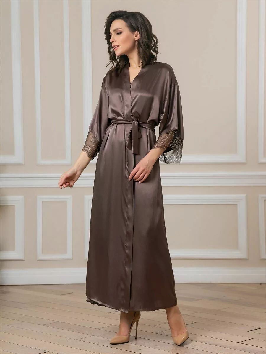 Длинный халат на запах из искусственного шелка с поясом, декорирован кружевом по рукаву.