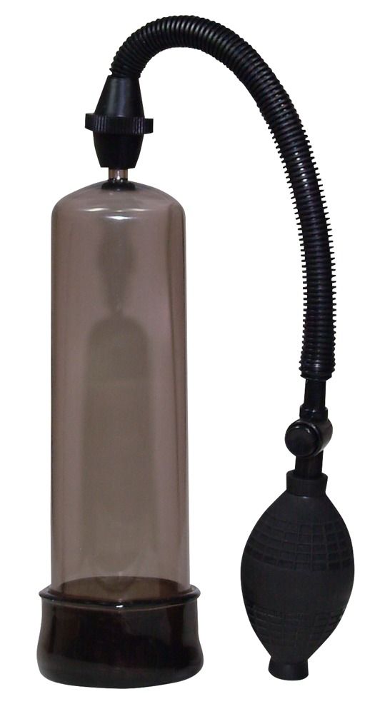 Вакуумная помпа черного цвета для мужского полового органа. Прозрачный пластиковый цилиндр со съемным мягким вкладышем.