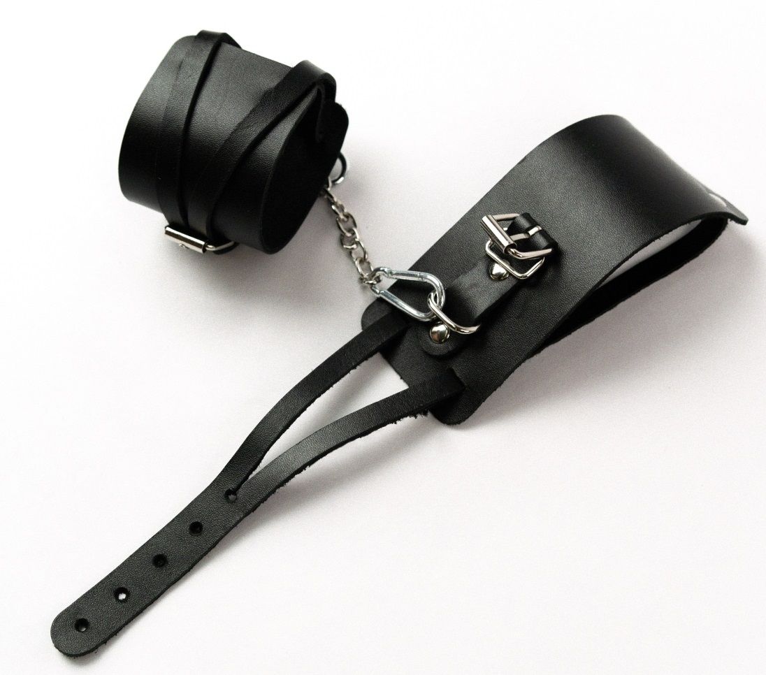 Кожаные оковы с креплением в виде веревочек. Оковы снабжены металлическими кольцами и сцепкой.