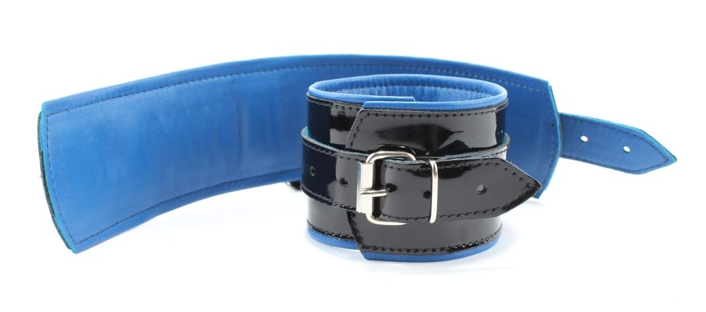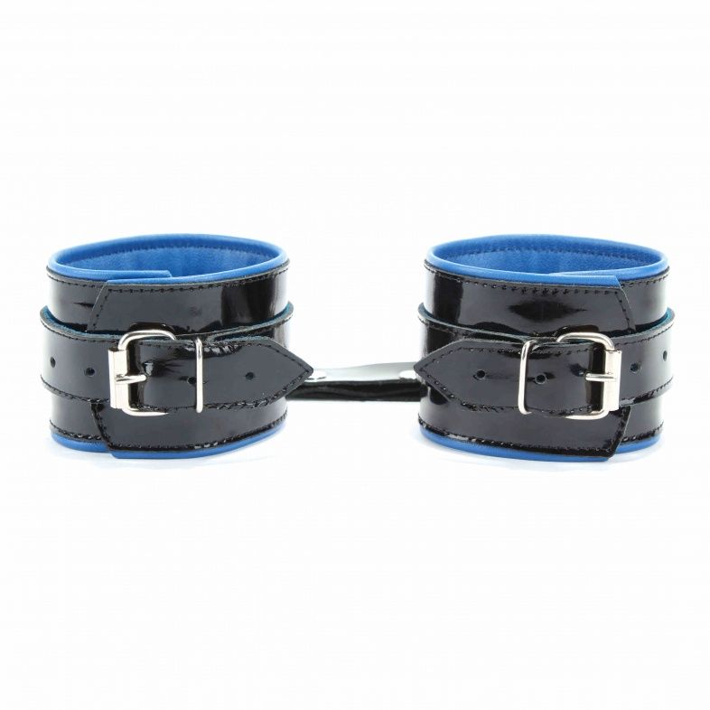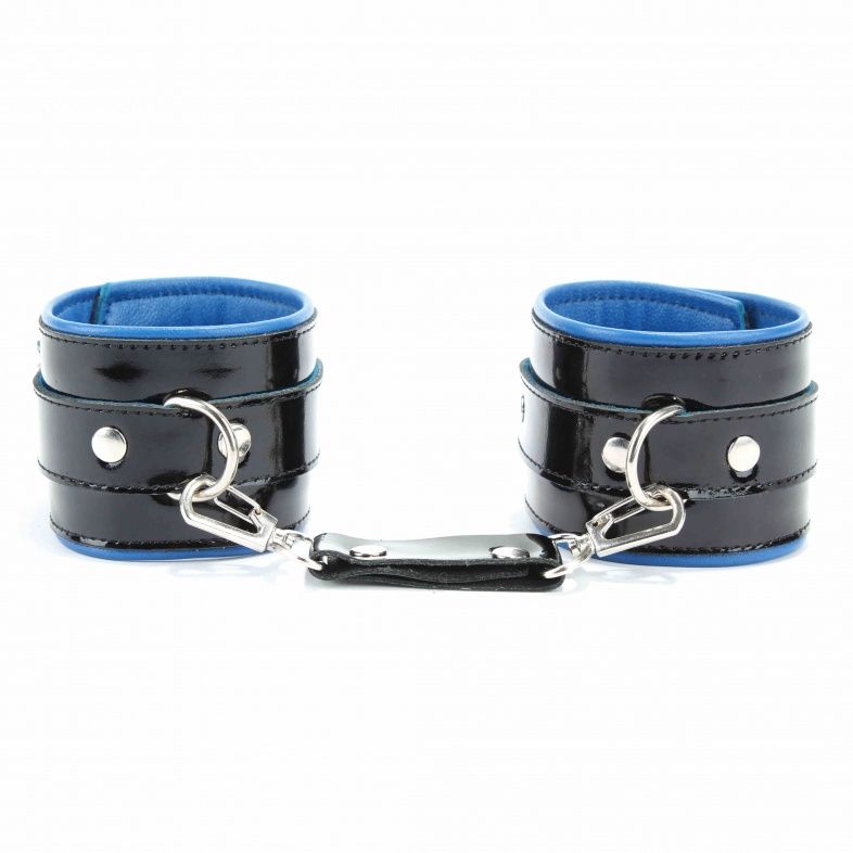 Наручники из натуральной кожи с лаковым покрытием, Подклад из нежной кожи контрастного синего цвета. Сварная металлическая фурнитура и цельный хлястик для надежной фиксации. Ширина - 6 см.
