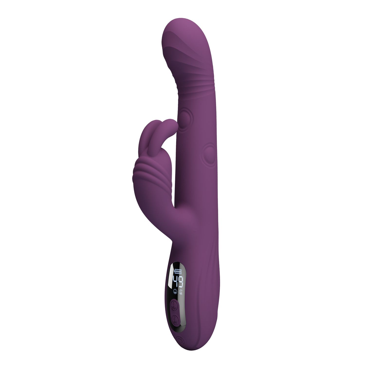 Фиолетовый вибромассажёр-кролик Dee. 9 режимов вибрации, 4 режима кивания, 4 режима постукивания. Рабочая длина - 14 см.